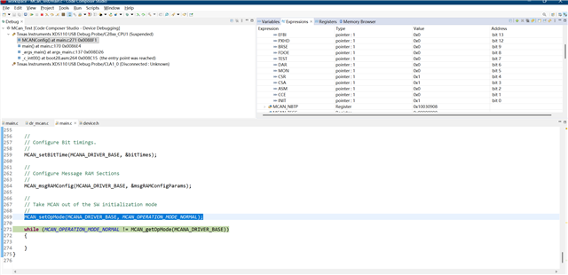Using the LAUNCHXL_280039C development board, the 280039C/MCAN example (mcan_ex7_classic_transmit) is builded, the CAN message cannot be sent. MCAN_TXBRP.TRP0 always 1, and MCAN_CCCR.INIT = 1. The line of code below cannot change the INIT state.