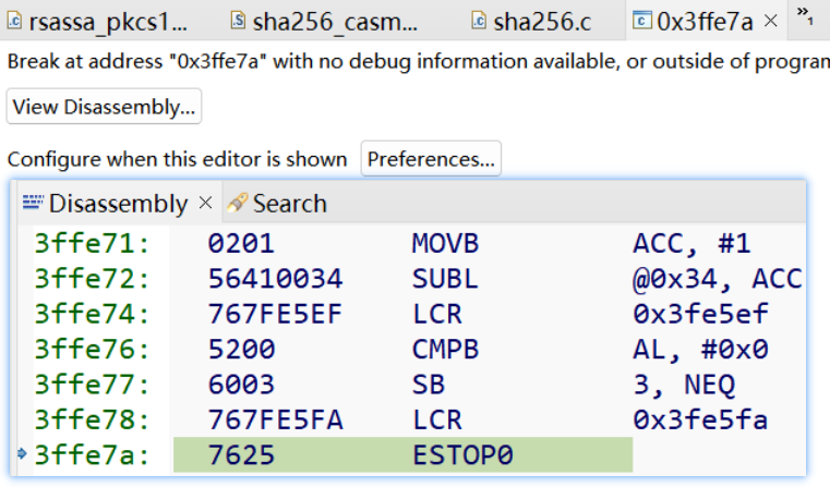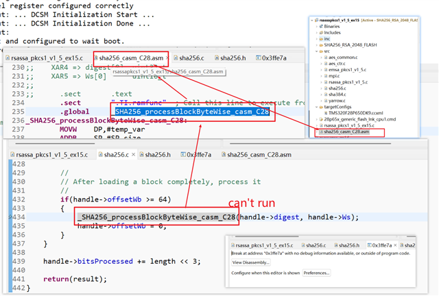在C2000Ware_5_02_00_00\libraries\security\crypto中导入了例程rsassapkcs1_v1_5_ex15,导入P65的ccxml,以及p65的asm文件,编译导致问题如图,请问如何能运行该加密函数库