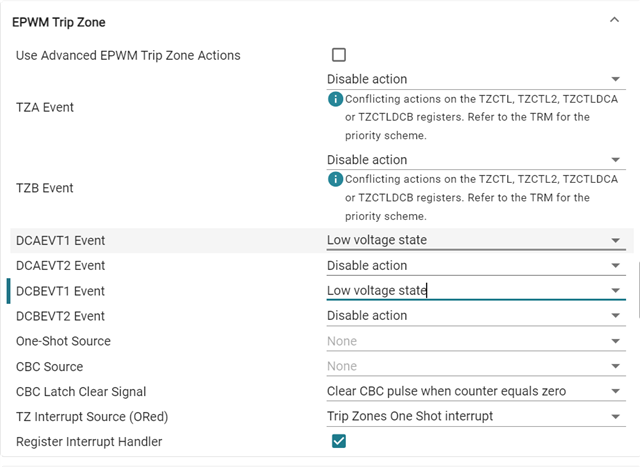 您在另一个帖子(+) TMS320F28374S: 如何实现接收到外部TZ信号延迟后再关闭ePWM功能? - C2000︎ 微控制器论坛 - C2000 微控制器 - E2E 设计支持 里面咨询了类似问题,请在此查看回复。