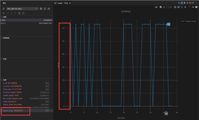 进行电机控制,需要打出电机转速曲线,调试界面数据显示正常,但是graph打出来完全是乱的