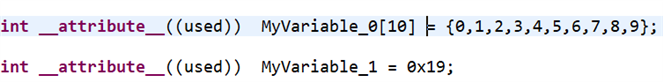 测试如下,定义两个变量,程序中都没有被使用到。其中一个是数组。为了避免被优化,都使用了__attribute__((used))进行修饰。