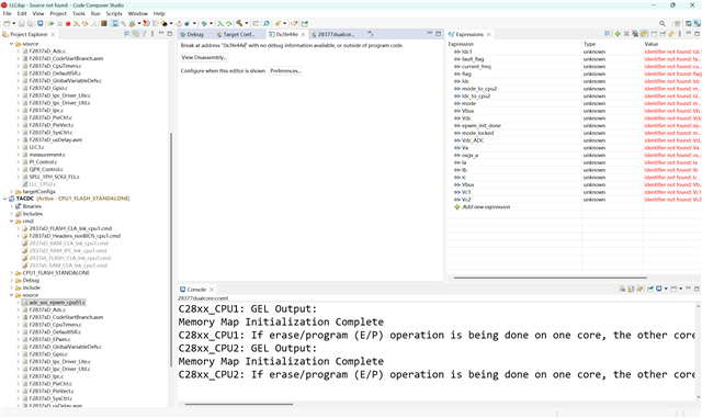 而如果按双核烧写的流程先connect cpu1,cla1,cpu2,然后分别load cpu1,cpu2的.out文件,对cpu1cla load symbol,再依次run cpu1,cla,cpu2,发现无法进到cla中断里(通过观察cla中的变量osgx_a)并且cpu1似乎也没有在进程中因为观察变量没有实时刷新,run cpu1会显示跳转:Break at address "0x3fe44e" with no debug information available, or outside of program code.