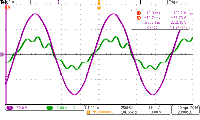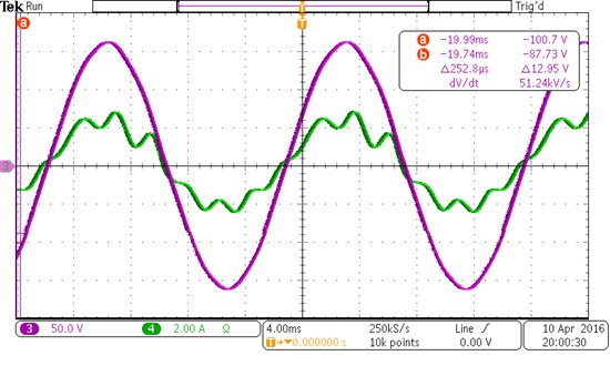 我现在在用的是HV DC-AC逆变器开发板,里面的程序是2P2Z的电流控制器,我现在想重新设计一个PR控制器,但是现在的问题是很多时候都在谐振,我已经尽量把截止频率设在1kHz左右了,但是测到的谐波特别大(下图),如果我增加kp的大小,截止频率就上去了,然后就谐振了。请问大家有什么方法设计PR参数能出一个比较好的电流波形?谢谢!