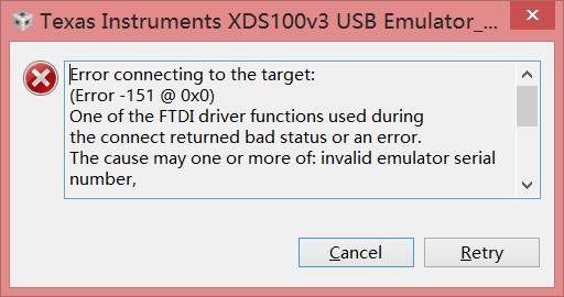 请教下:64位WIN8操作系统,CCS6.0的环境,仿真器为TIDSP-XDS100V3,目标板CPU为TMS320F2808;仿真器插上电脑的USB口经常报“Error -151”和“Error -154”的错误,感觉是连上了一下就又断开了,有点像USB口接触不良,但试了电脑上的4个USB口都是这样,试了其他几台笔记本也有出现这种情况的,但有的就是好的,试了两台台式机都没有问题。只插仿真器,不连目标板也是这样。