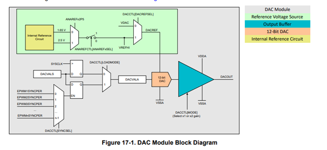 如下所示、两个内部 DAC 都以 VREFHI 引脚为基准。 它们的输出通过模拟引脚输出。