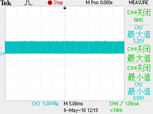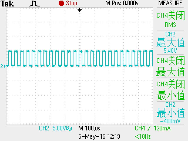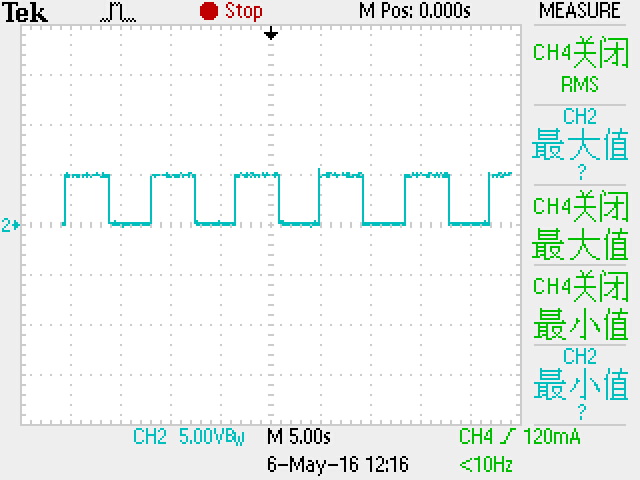 以下图片是占空比固定为53%的PWM信号,示波器时间刻度由 5s/格 逐渐变小
