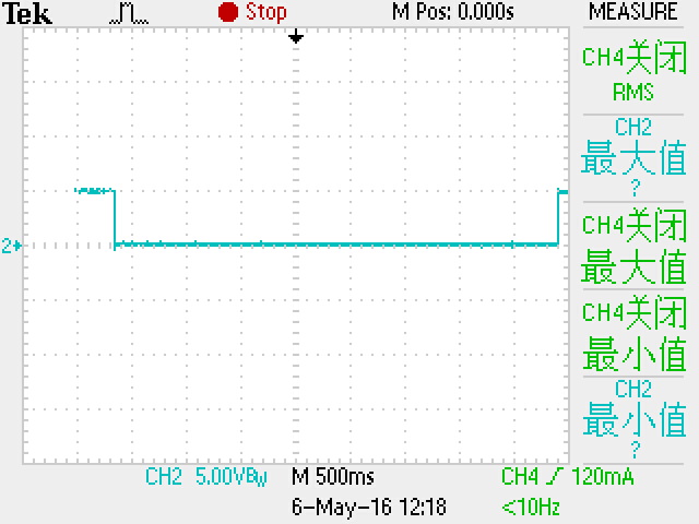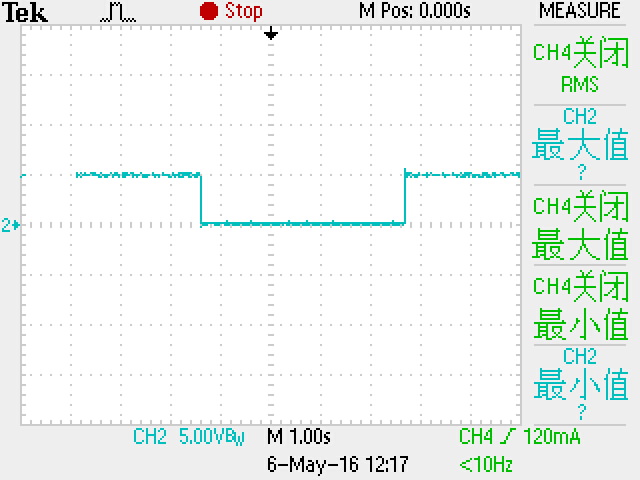 请注意 5s/格 的波形,每隔大约4.1s就会突变一次(所以我在调试数字电源的时候主电路每隔4.1s主电路波形就受此影响突变一下)