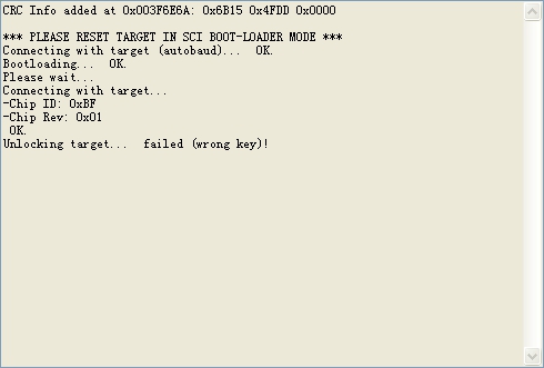 开始烧录时到擦除Flash A卡住了,后来就如附件截图(Wrong Key)那样了,用串口工具发数据41AA080000000000000000000000000000000000000000800000000C011223344556677有相同的回复,三个SCI模式控制脚逻辑正确,求大神回复!!!
