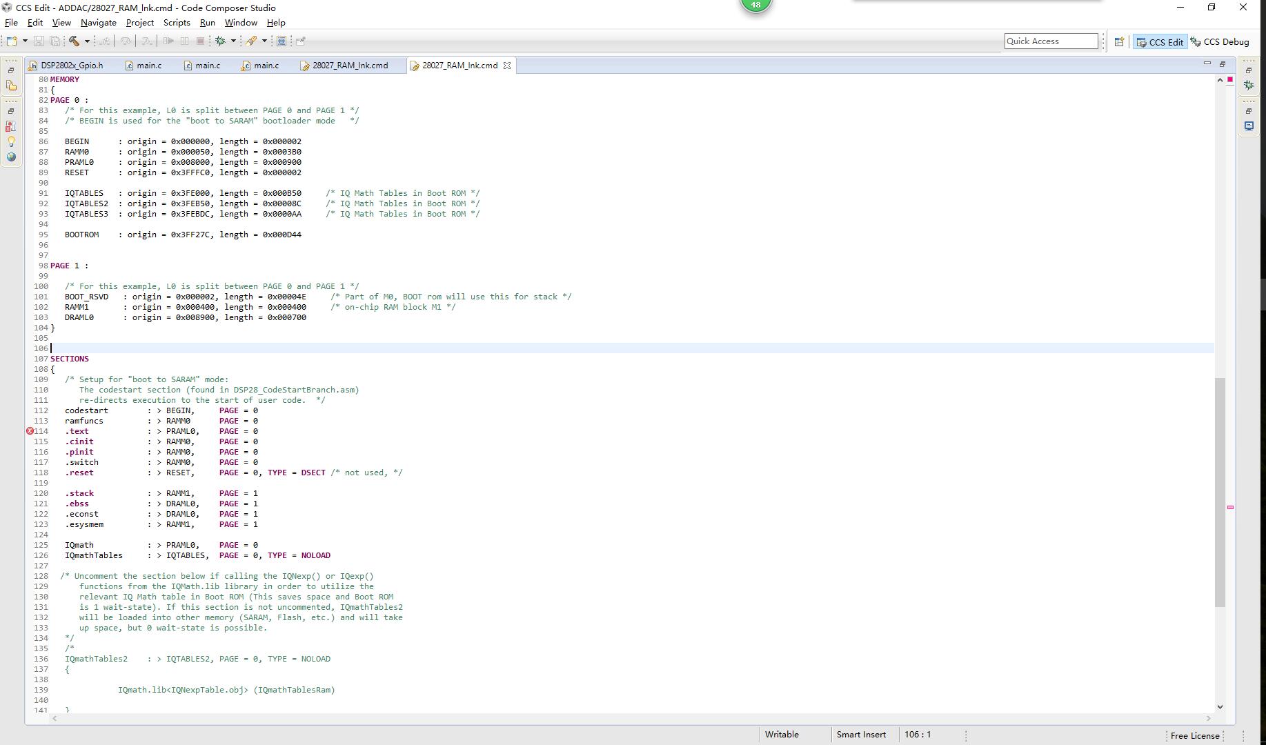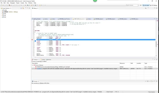 你.text段太大,RAML0塞不下,建议你在CMD的memorymap中合并两个RAML区域,然后再把.text放在这个区域中