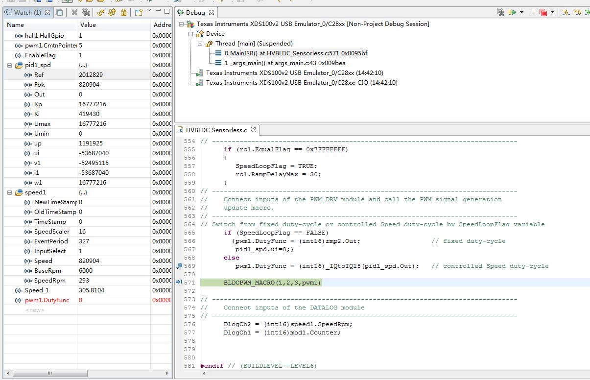 上图是程序运行到第一次pi.h时的中断结果,计算出来的占空比结果总是等于零,请问是怎么回事?调节了Kp和Ki的值还是不行,得到的占空比太小电机也不转
