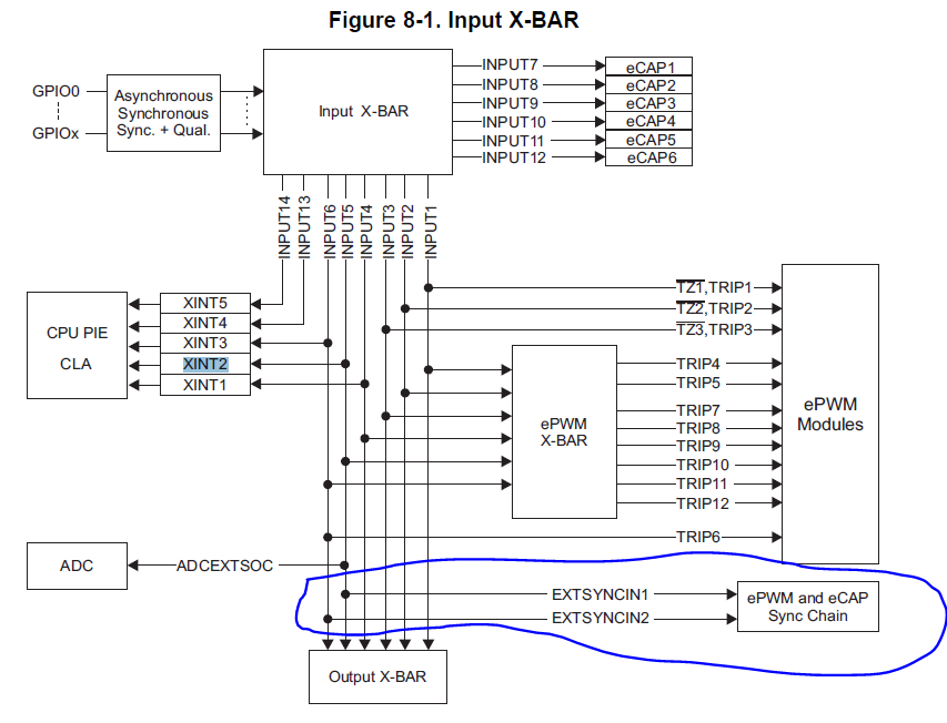 CPU1控制电机1、2、4(CPU2PIE中的xINT2不使能,仅通过XBar将中断信号配置到input5中,配置方法如下)