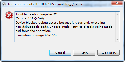 Device blocked debug access because it is currently executing non-debuggable code. Choose 'Rude Retry' to disable polite mode and force the operation.