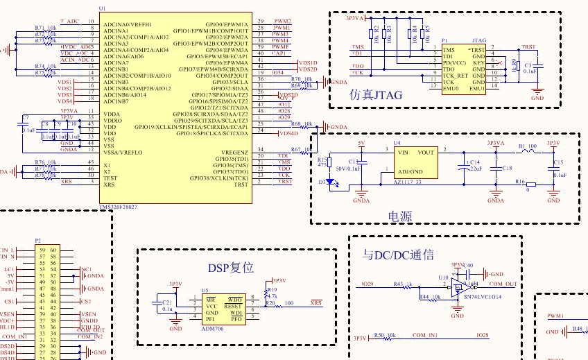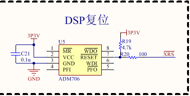 3.3V加了一个上拉电阻接到28027的XRS(复位)脚,除了电源以及JTAG,其他什么别的无关的电路都没有加。