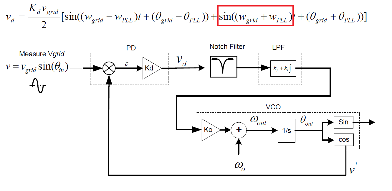 ynotch是陷波滤波器,因为在锁住的情况下,Vd的包含2次谐波分量,需要把这个谐波分量滤除,由于市电频率一般是50Hz或者60Hz,2倍谐波就是100Hz或者120Hz左右,低通滤波器带宽要很窄才能滤除这个信号,带宽窄意味着PLL系统动态响应慢,所以加了陷波器,滤除这个信号,后级的PI调节器(也是低通滤波器)带宽可以设计得大些.