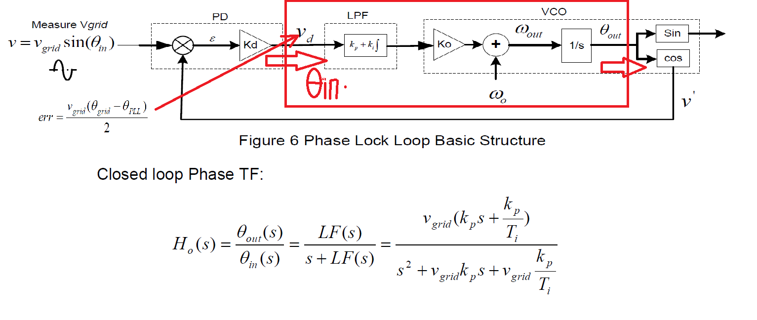 由于Vd的表达式含有Vgrid和相位差,所以在下图的输入相位和输出相位传递函数开环传递路径上就有PI kp+ki/s和积分1/s,同时又放大的增益Vgrid.
