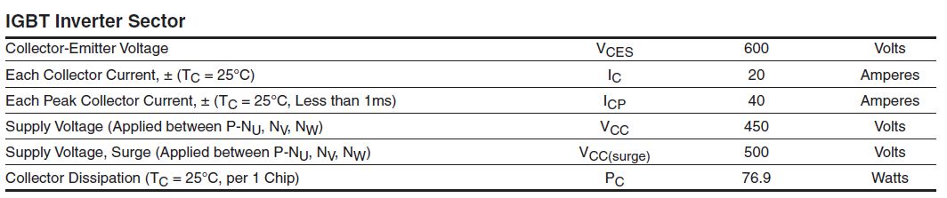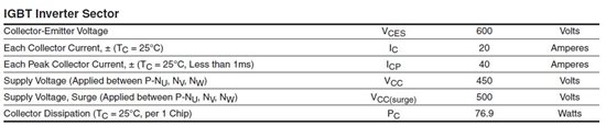 IPM采用三菱的PS21765,600V,20A额定电流,40A峰值电流。具体参数如下: