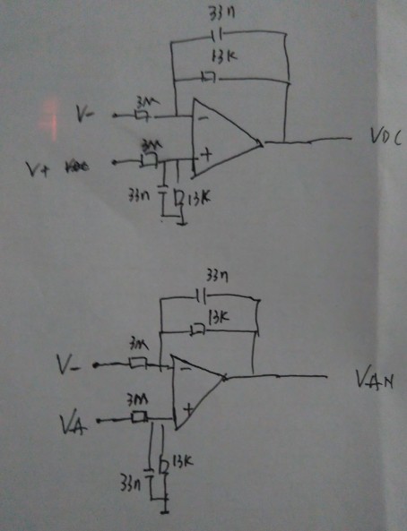 1、电压采集电路:VB,VC等同于VA电路,其中,V-代表直流电压的负极,电机的相电压均相对于直流电压负极即V-,直流电压采集与相电压采集电路参数相同,同为差分电路,比例关系一致,增益为0.004333;