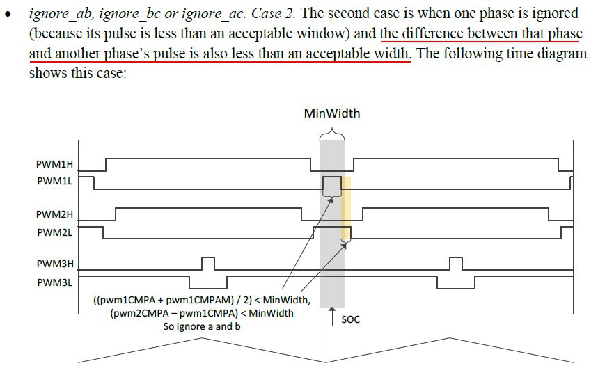 第二种情况是:有一相的下桥臂开关管脉冲宽度小于最小采集宽度,另外该相下桥臂开关管的脉冲与另一相下桥臂开关管的脉冲之间的宽度小于最小采集宽度。请问这种情况为何要忽略两相的电流值?