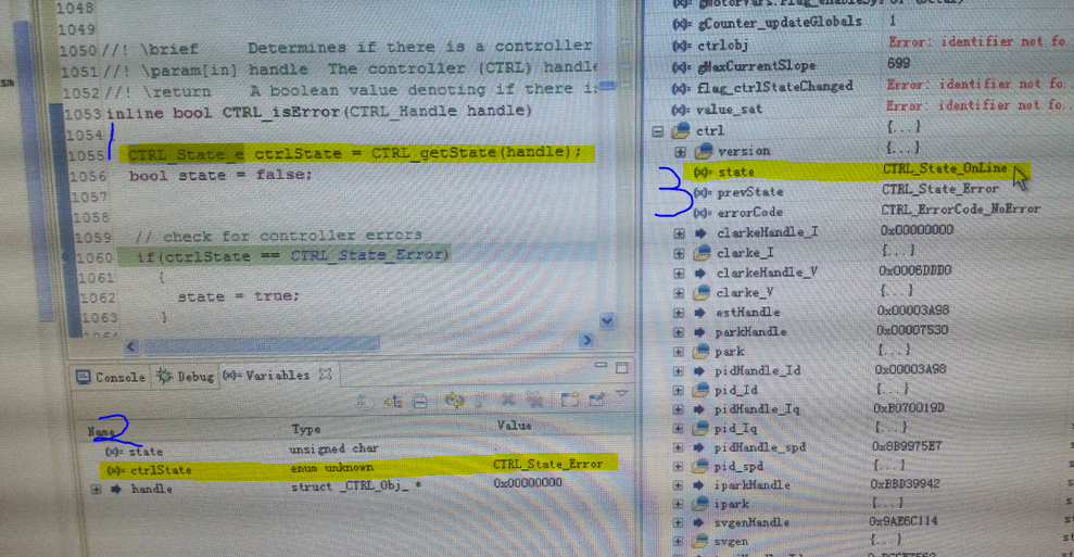 在子函数CTRL_isError中单步运行,发现问题如下图所示。局部变量ctrlState为CTRL_getState(handle)返回值(图中1处),值为CTRL_State_Error(图中2处),但观察结构体ctrl中state值却为CTRL_State_OnLine(图中3处),我瞬间有点接受不了了.....请问这是什么情况?问题在哪里?