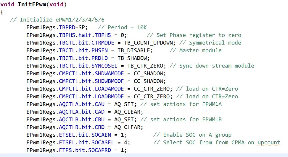 将EPwm1Regs.CMPA.half.CMPA或者EPwm1Regs.CMPB寄存器置为0,用示波器测量还是会有一个尖尖的脉冲,亲。因为我要实现占空比0-90的调整来控制电机,其它都没什么问题,就是占空比为0调不起来,寄存器置0还是会有一个尖脉冲。