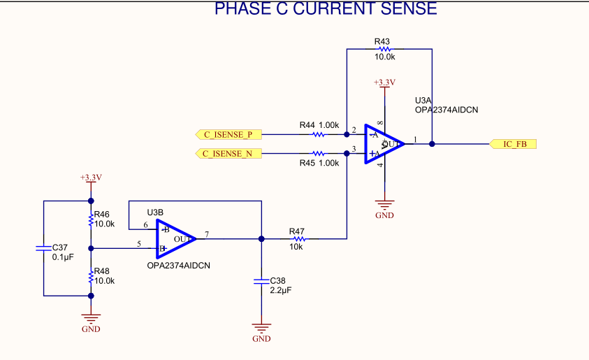 这是官方的 差分检测c相电流,运放做比较,我想问下,在U3B输出1.65V后经R47 到U3A的3脚,而R45相当于接地。是不1.65V是经过分压得到的0.15V进入运放U3A的3脚,实际中我也测得0.15V。怎么能够以1.65V为基准呢?求教。