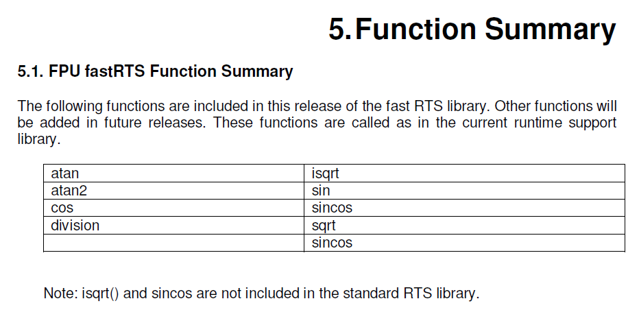 本人在调用和测试快速浮点运算库rts2800_fpu32_fast_supplement.lib时根据其相应的数据手册controlSUITE_C28x_FPU_FastRTS.pdf中看到所涉及的运算符不多,如下表所示: