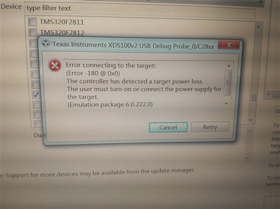 您好,按下图给HVPMSMMTR连接上XDS100V2和外部电源,插上F28335controlCARD2.2卡,在CCS6上用controlsuitet中FOC无传感器(Delfino F2833x)这个例程连接目标板时始终出错,见下图。XDS100V2已经在CCS6中用自制的28335电路板和FOC无传感器(Delfino F2833x)这个例程链接试过没有问题,只有可能HVPMSMMTR上的开关哪儿设置不对导致连接不上,请问HVPMSMMTR板上 和F28335controlCARD2.2卡上的开关如何设置 ,能否给出具体的操作步骤和图片 。急等!!!