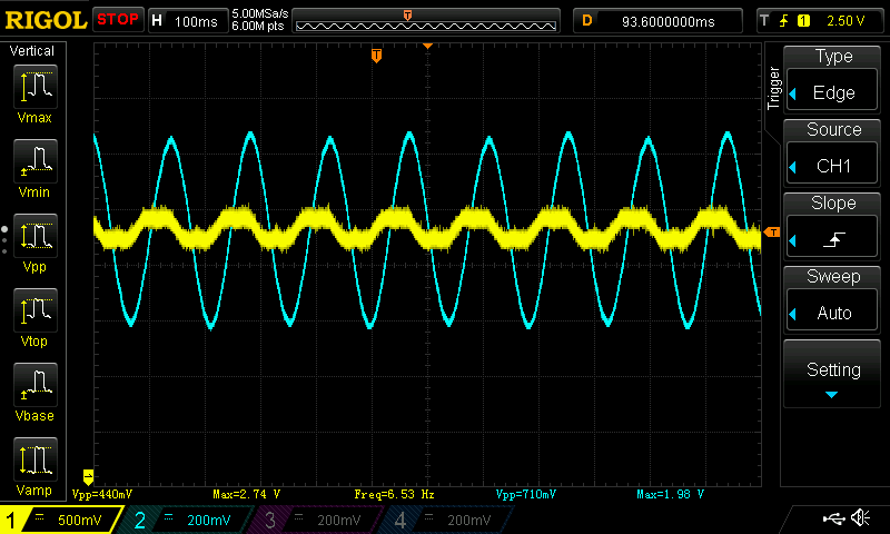 正弦的是电流,黄色的是电压,PMSM的无感矢量控制,黄色波形是电机相电压经过RC低通滤波器后的波形,这种滞后对吗?