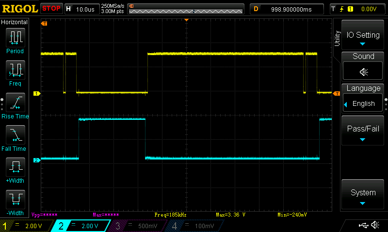 PWM的波形如下图所示,黄色的是桥臂上管信号,蓝色的是桥臂下管信号。