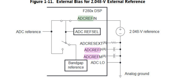 AdcRegs.ADCREFSEL.bit.REF_SEL = 1;//External reference, 2.048 V on ADCREFIN add 2017 外部基准必须在带隙电压上电之前配置