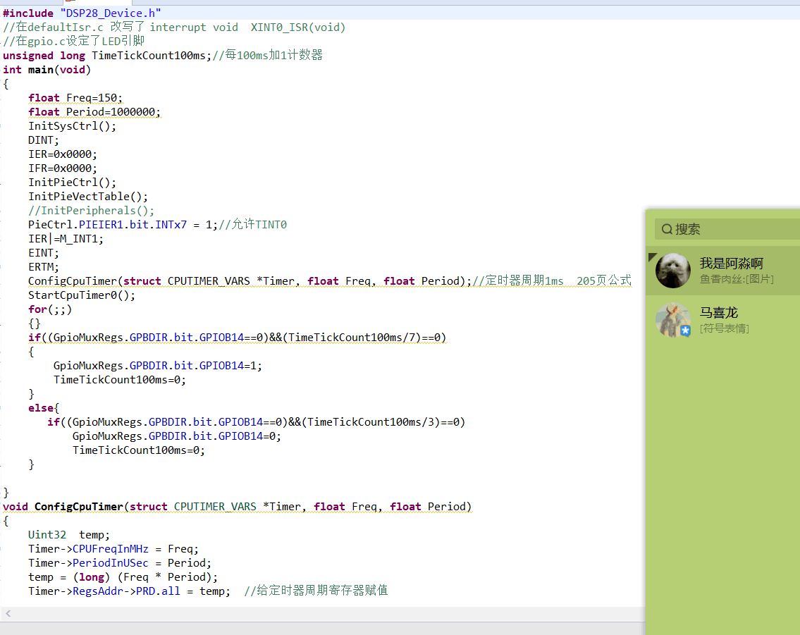ConfigCpuTimer(struct CPUTIMER_VARS *Timer, float Freq, float Period);//定时器周期1ms 205页公式 这句话错了