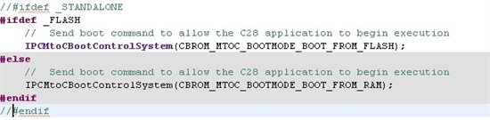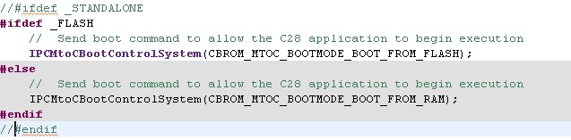 下图是 M3 中的部分代码截图,单步发现,程序并没有调用任何 IPC 函数,发现 “STANDALONE“ 并没有想象中是认定的,所以这部分预编译的内容都没有编译进去。所以这段代码并没有运行,以致 C28 不能进行 C-BOOTLOADER,所以跑不了。