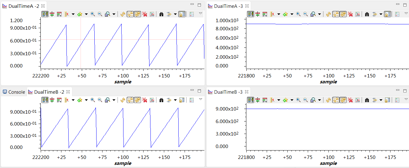 我在使用28377sLaunchPad+DRV8301进行无位置传感器开发,程序是在有位置传感器例程MonoMtrServo_377s(参考了2803x的PM_Sensorless例程)上改的,将Buildlevel设置为4时,此时系统为速度电流双闭环控制,同时通过ADC采样出电压和电流信息,使用SMO_MACRO函数进行位置估计,使用SE_MACRO解算出速度,将估计的位置和速度与实际的位置速度对比,如下图所示: