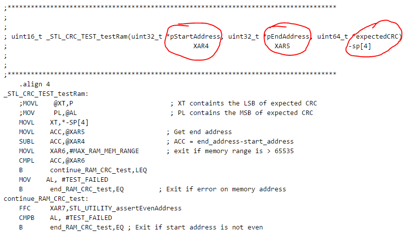 C:\..\IEC60730\C2000MCU_IEC60730_4_00_01_00\IEC60730_STL_Library_v4_00_01_00\IEC60730_safety\v4_00_01_00\source\c28x下的STL_crc_test.asm文件里面的函数uint16_t _STL_CRC_TEST_testRam(uint32_t *pStartAddress, uint32_t *pEndAddress, uint64_t *expectedCRC) ,在此函数的实现中形参pStartAddress是传入XAR4,pEndAddress传给XAR5,expectedCRC传给-sp[4]。
