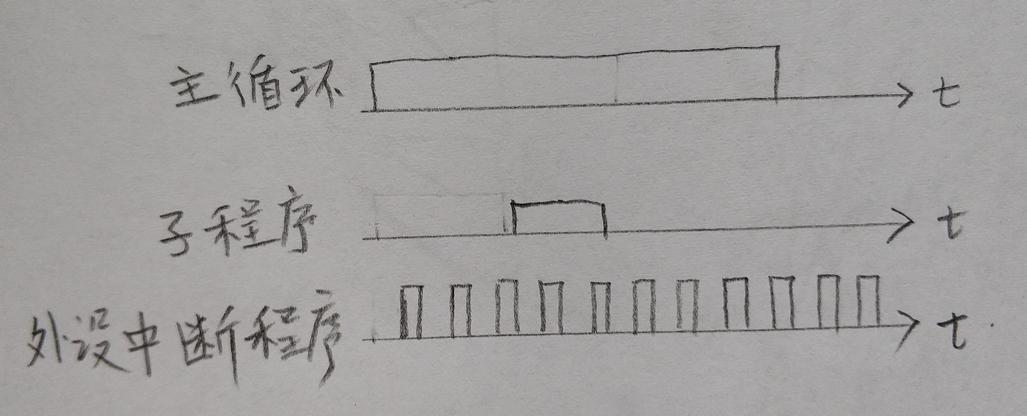 如下图,主循环程序执行周期较长,外设中断程序最高优先级,需要保证定时开启并执行,当中断程序执行一定的次数后把所有数据进行计算一遍,也就是子程序中计算,在子程序中计算时不能影响中断程序继续按时中断。