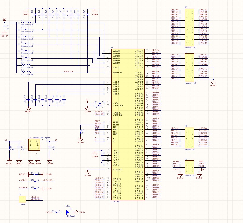 僅佈線F28069MPZT周邊電路,拉出GPIO、ADC、TDI、TDO等腳位