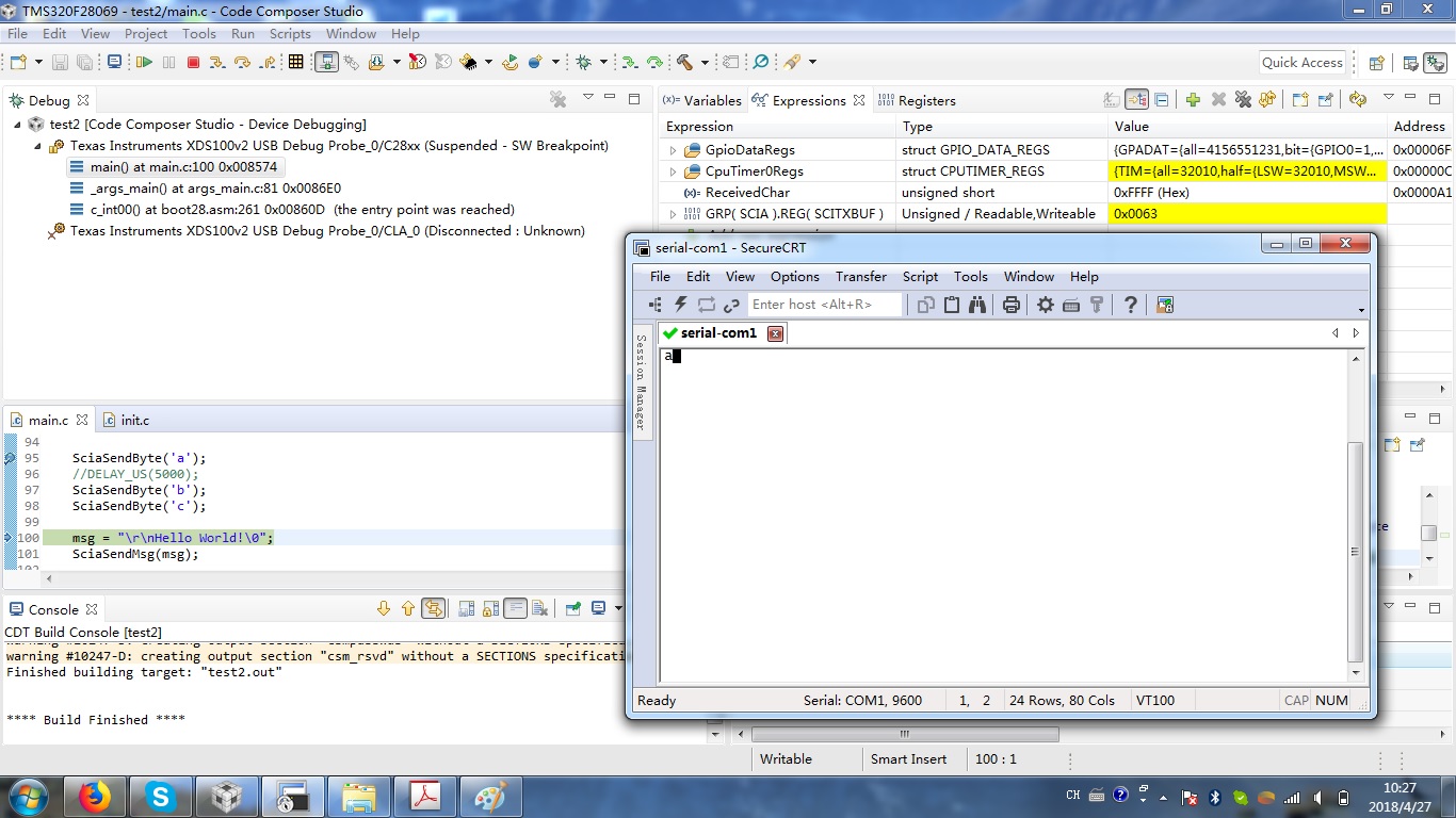 例如,我先定义一个字符串“abcdefg\0”, 用sci 查询发送,没有用FIFO,直到遇到‘\0’。但是串口调试助手只能收到abcde, 但是到最后SCITXBUF里面的是‘g’。