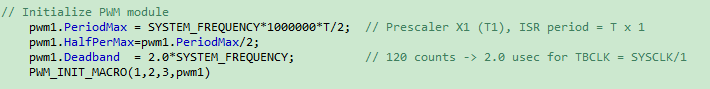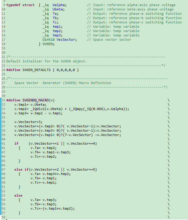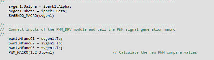 我在使用28335中电机控制的例程:HVPM_sensorless 2833x. 里面开始有生成pwm占空比的程序,如图。这个程序的占空比变化比较小,想问一下怎么修改程序能提高占空比的幅值的变化(除了提高输入的vdtesting和Vqtesti)。