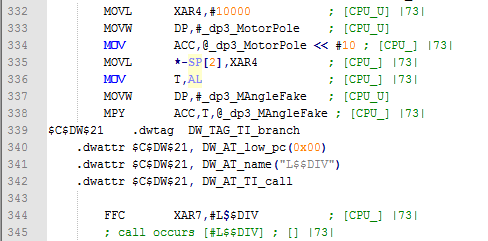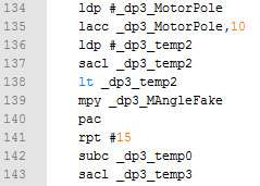 非常高效清晰:清晰是指_dp3_MotorPole(这里等于4)左移10位后成为d‘4096,装入16位的T寄存器,再乘以_dp3_MAngleFake后变成一个32位数,装入ACC,然后用16次SUBC指令完成除法。