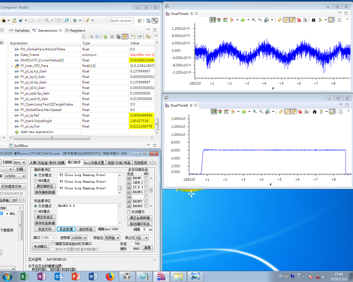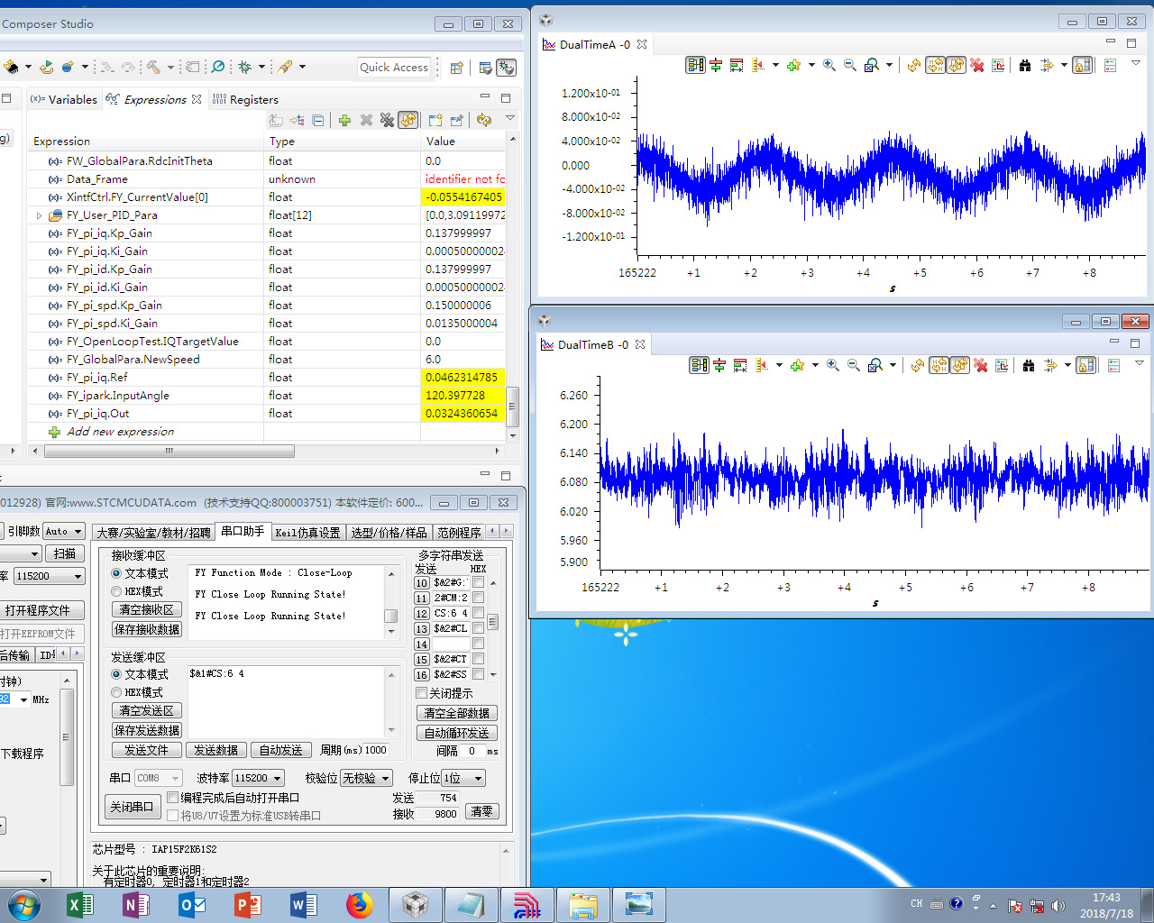 解释:该图显示的是电机启动过程,右上为A相电流波形,右下为转速波形,利用CCS以2ms间隔填充buffer的形式绘制的曲线