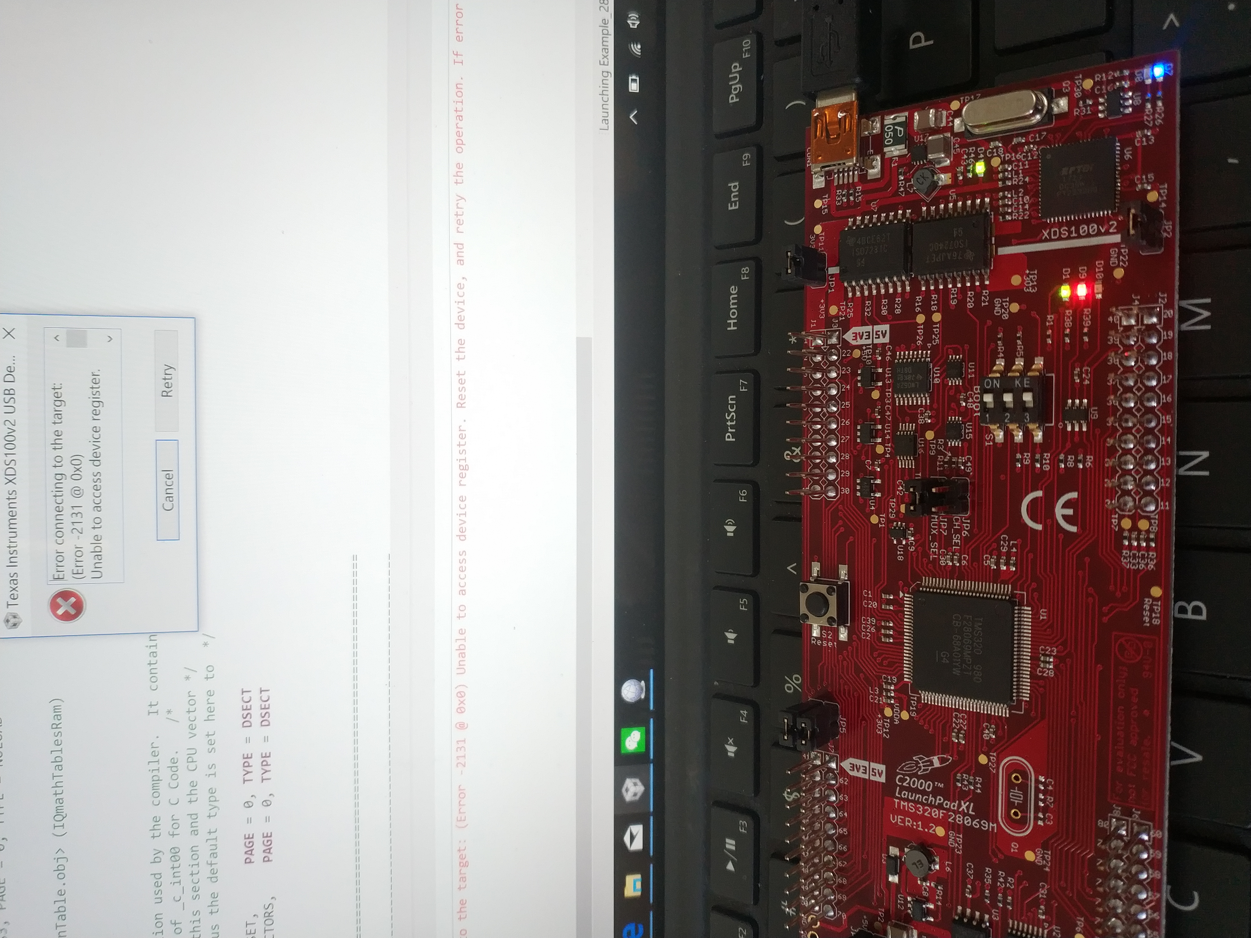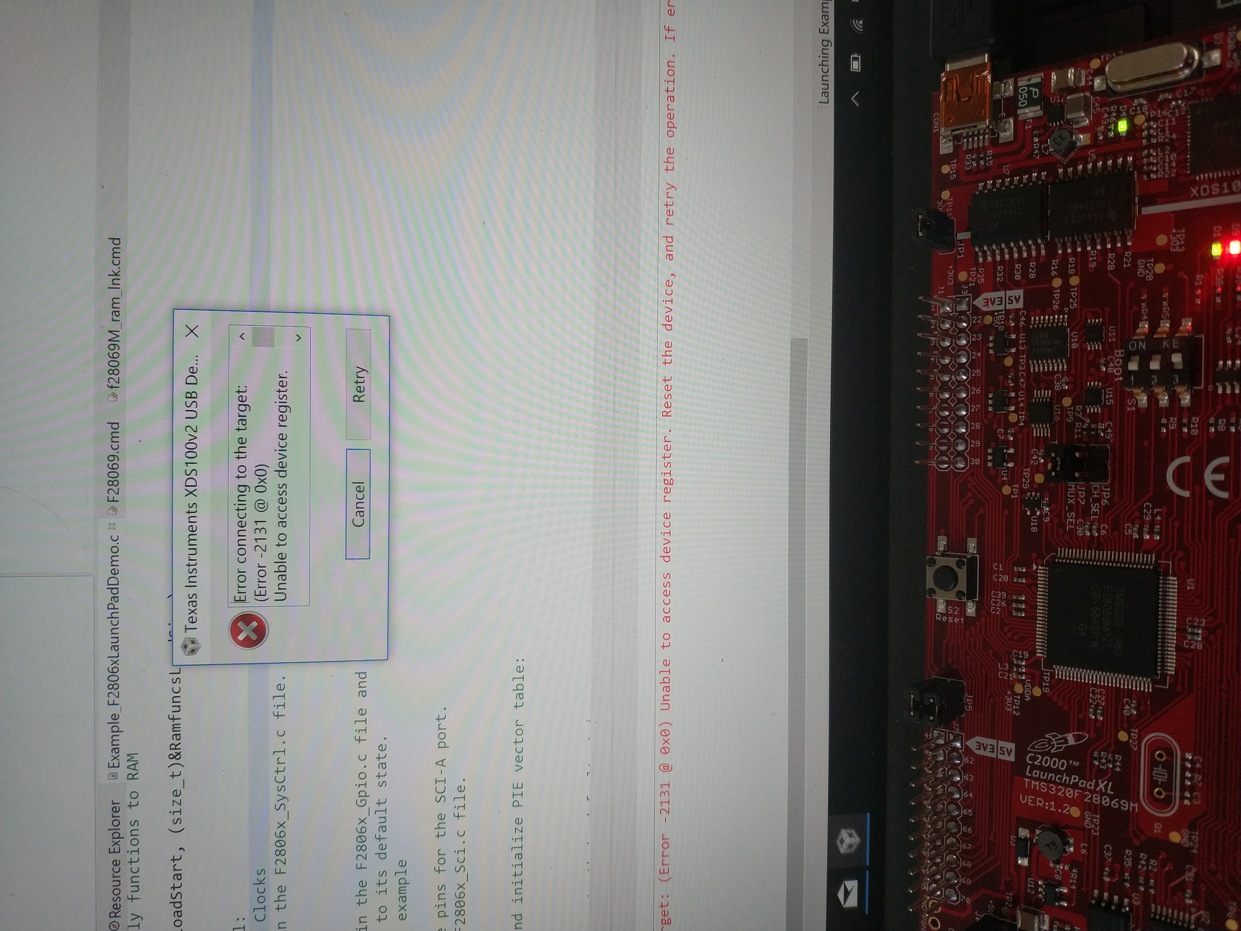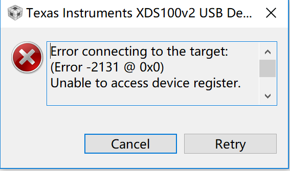 IcePick_C_0: Error connecting to the target: (Error -2131 @ 0x0) Unable to access device register. Reset the device, and retry the operation. If error persists, confirm configuration, power-cycle the board, and/or try more reliable JTAG settings (e.g. lower TCLK). (Emulation package 6.0.407.3)