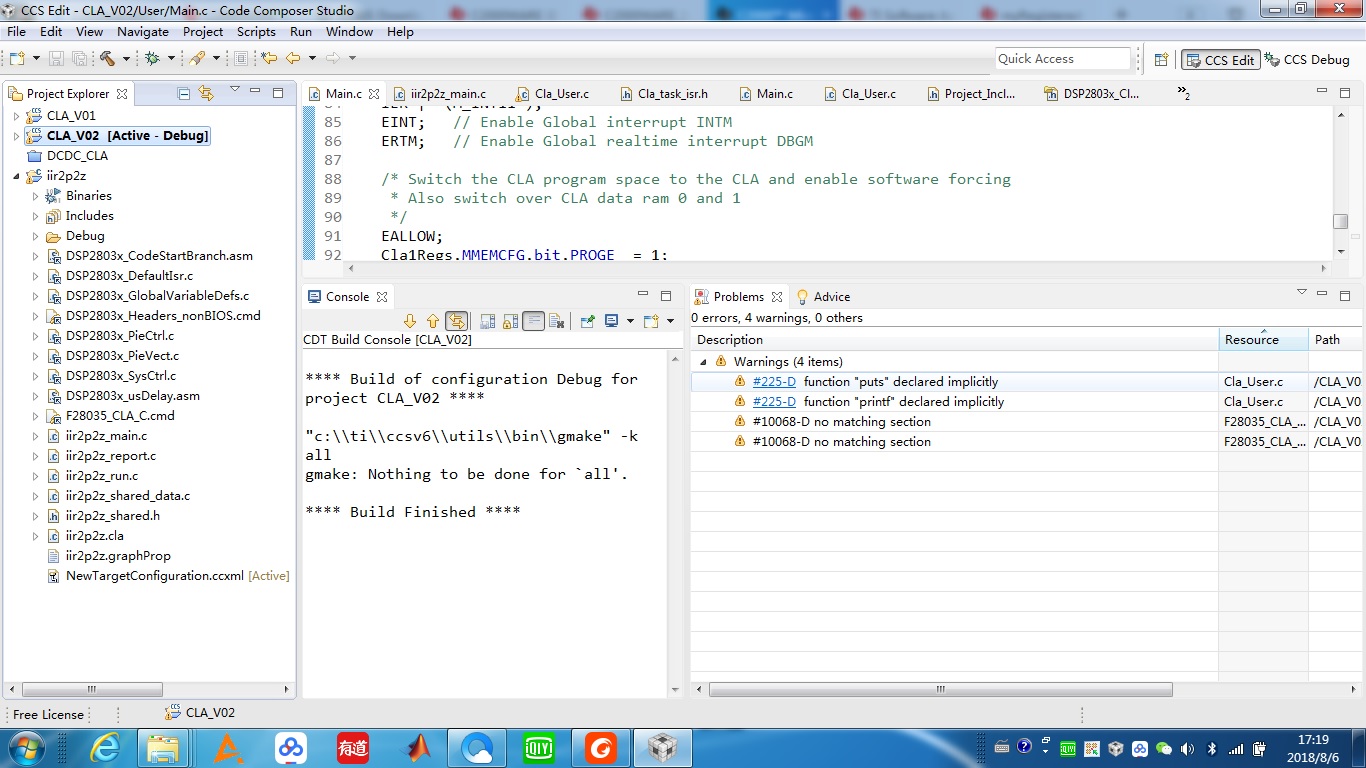 为什么,CLA例程iir2p2z编译没有警告,而我自己导过来就出现了下面这种警告? cmd文件用的是DSP2803x_common/cmd库里的F28035_CLA_C.cmd文件。