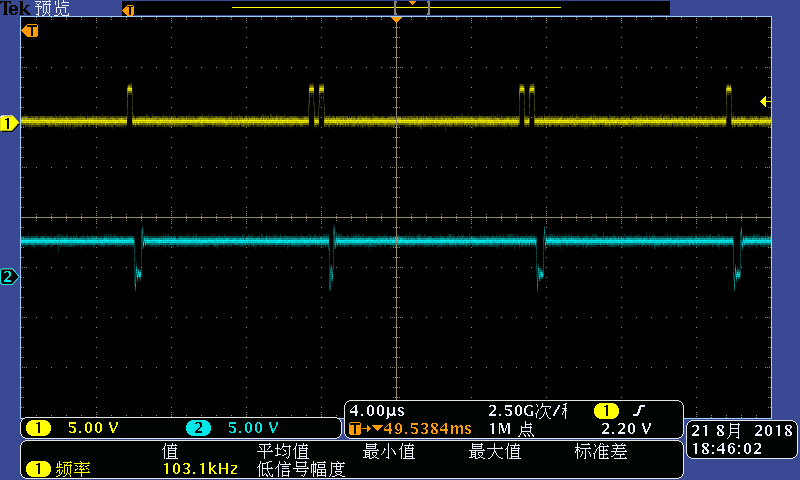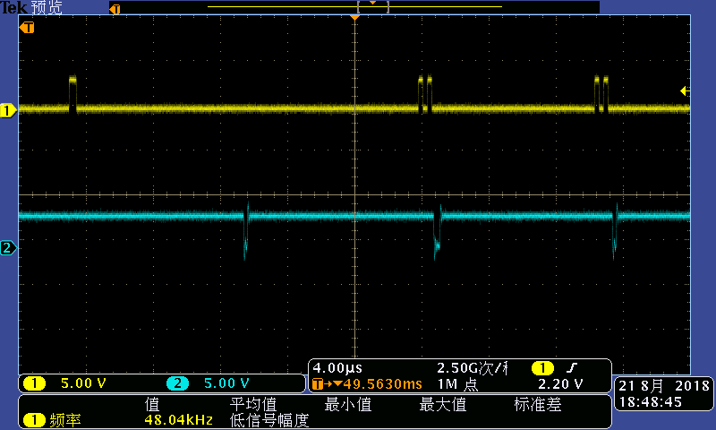 (下图中黄色为GPIO22输出,蓝色为GPIO20输出 )