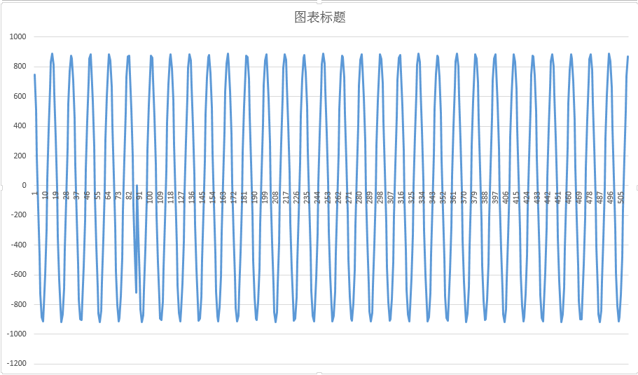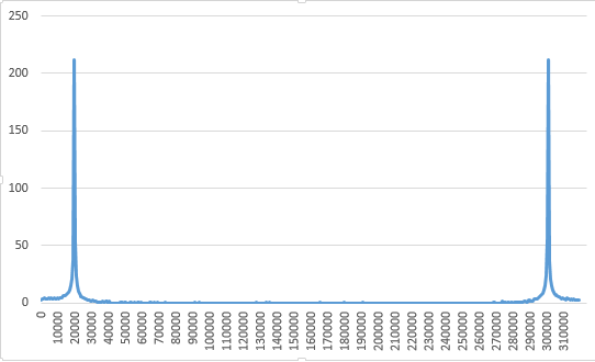 在程序里面使用了CFFT-512库函数,输入数组大小为1024,偶数项为如下图所示,奇数项都为0。采样频率320KHz,需要分析的信号频率20KHz,幅值880左右,采集了512个点