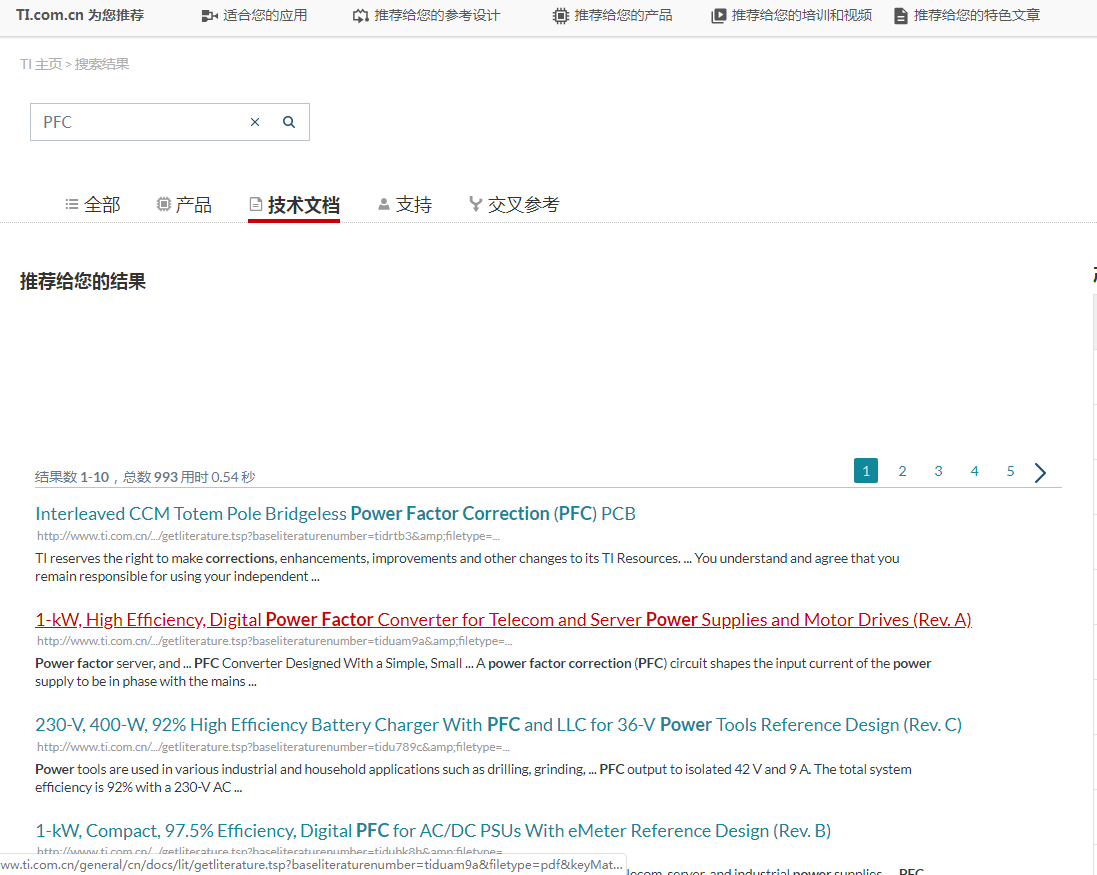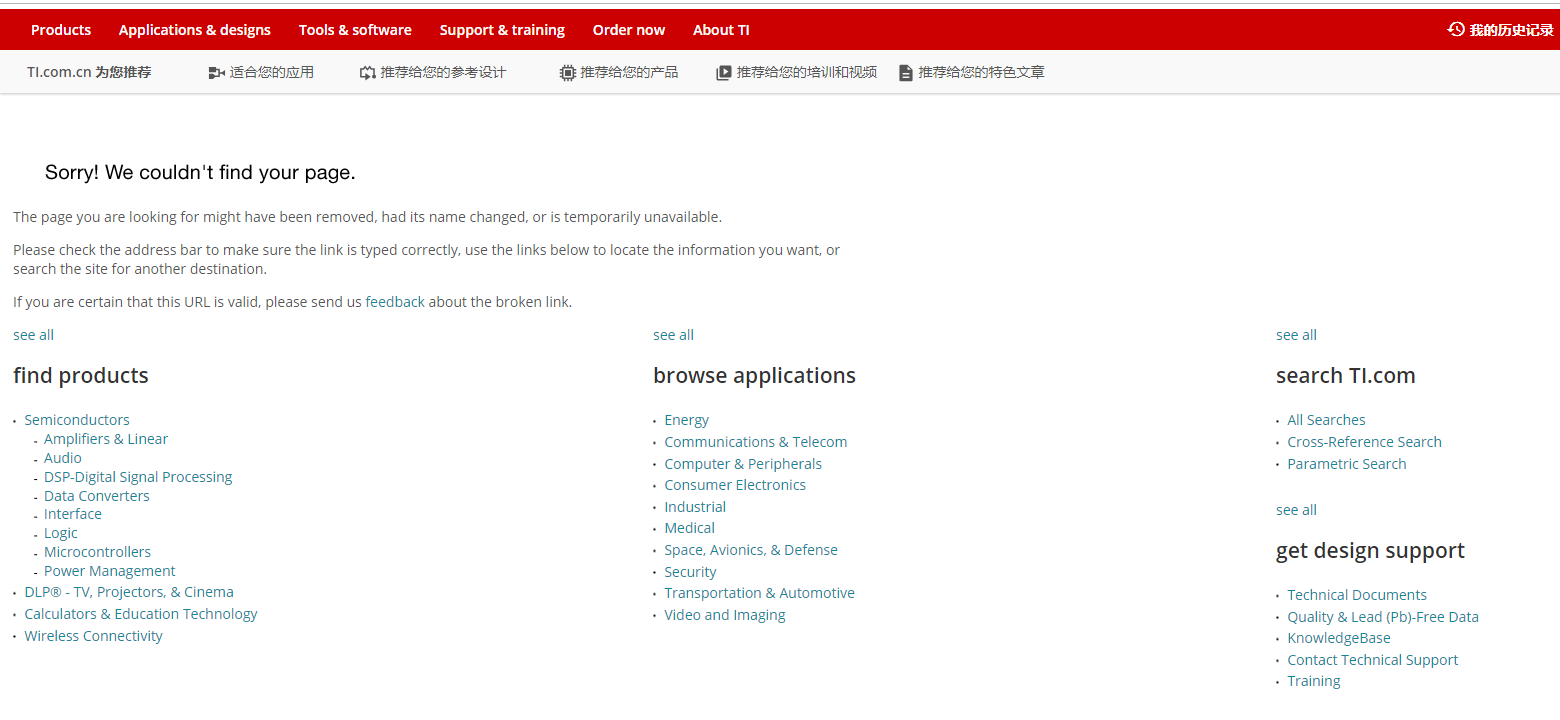 在TI官网寻找关于PFC实现的技术文档,输入“PFC”后确实搜索出一些列结果,但是点开后就提示“sorry,We coule't find your page”。