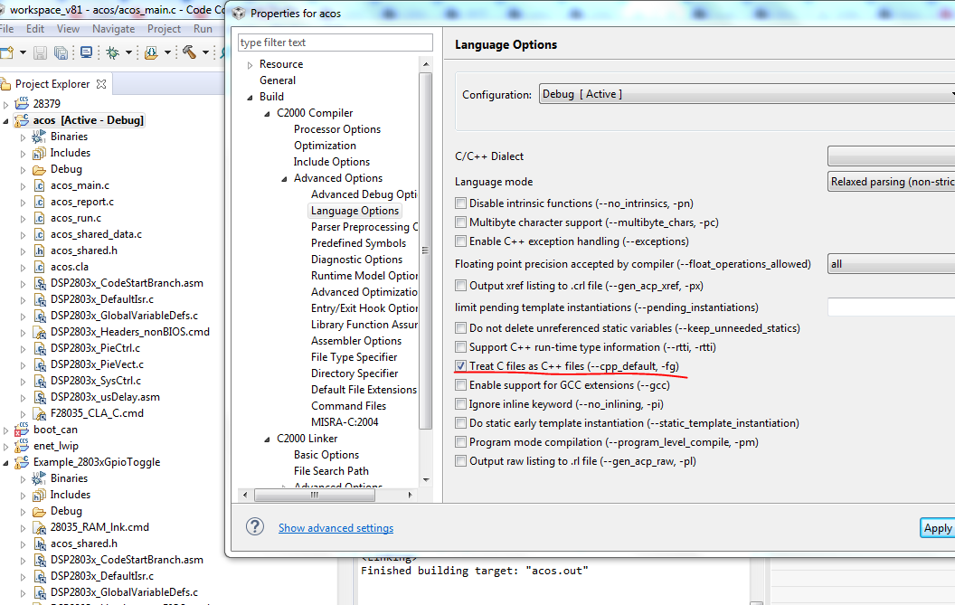 为了能正确编译,在build -> C2000 compiler -> predefined symbols  -> Undefined name 中设置__cplusplus时,并不能使编译器按C格式编译。