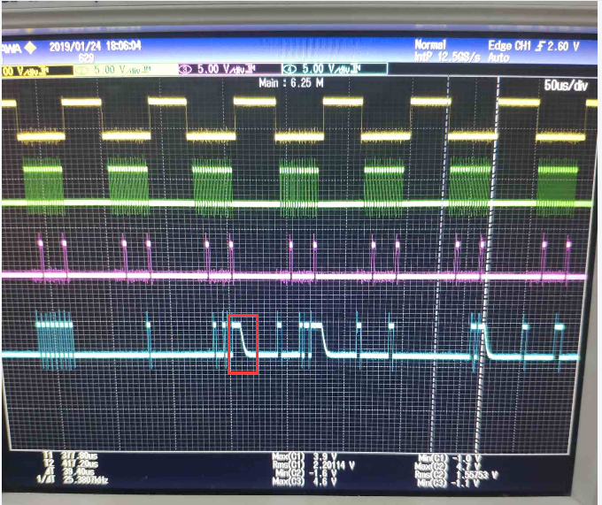 我用TMS570LS1224的两个SPI通道分别配置为主从模式,发现SOMI信号在帧与帧之间会有个奇怪的波形,谁知道是怎么回事吗?