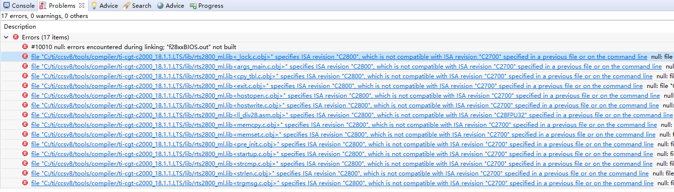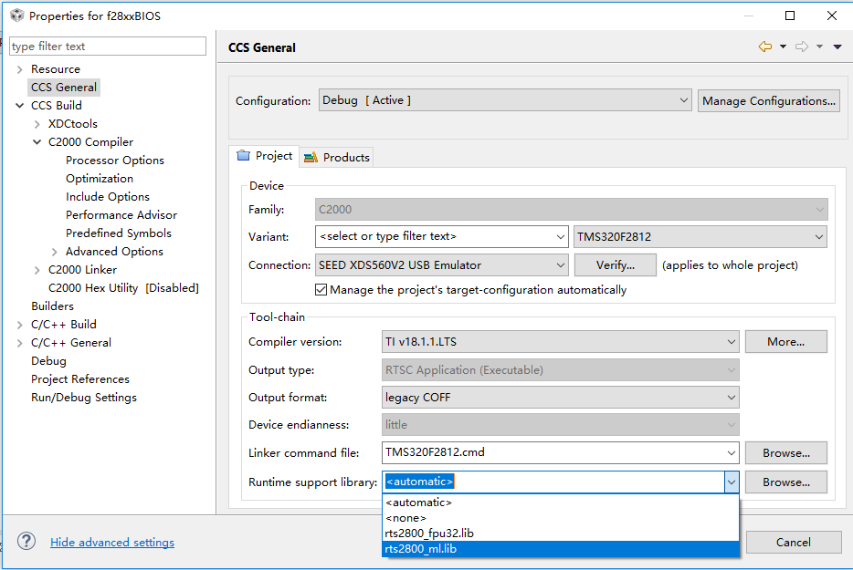 DSP使用TMS320F2812,在CCS5.2中建立BIOS工程,能够正常go main,但是在ccs8.0中 无法正常go main 。看编译结果,在CCS8中编译时,自动链接了2000系列的浮点库,而在CCS5.2中链接的是定点库。并且CCS8中未发现如何能正常链接定点库。