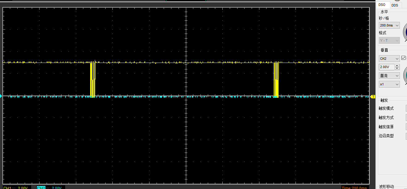 用PC串口助手每一秒发几个数字, 示波器看过两次发送间隔总线空闲时间很长, 足以满足SLEEP后10位或更长空闲时间, 两次接收到的数据间隔如下图