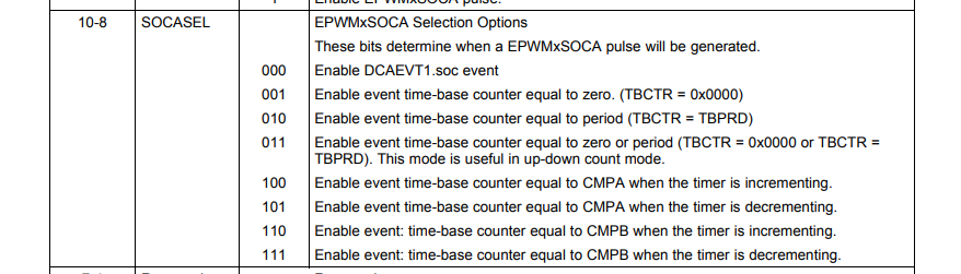 EPwm1Regs.ETSEL.bit.SOCASEL = 6; /* Enable CMPB event for SOCA */